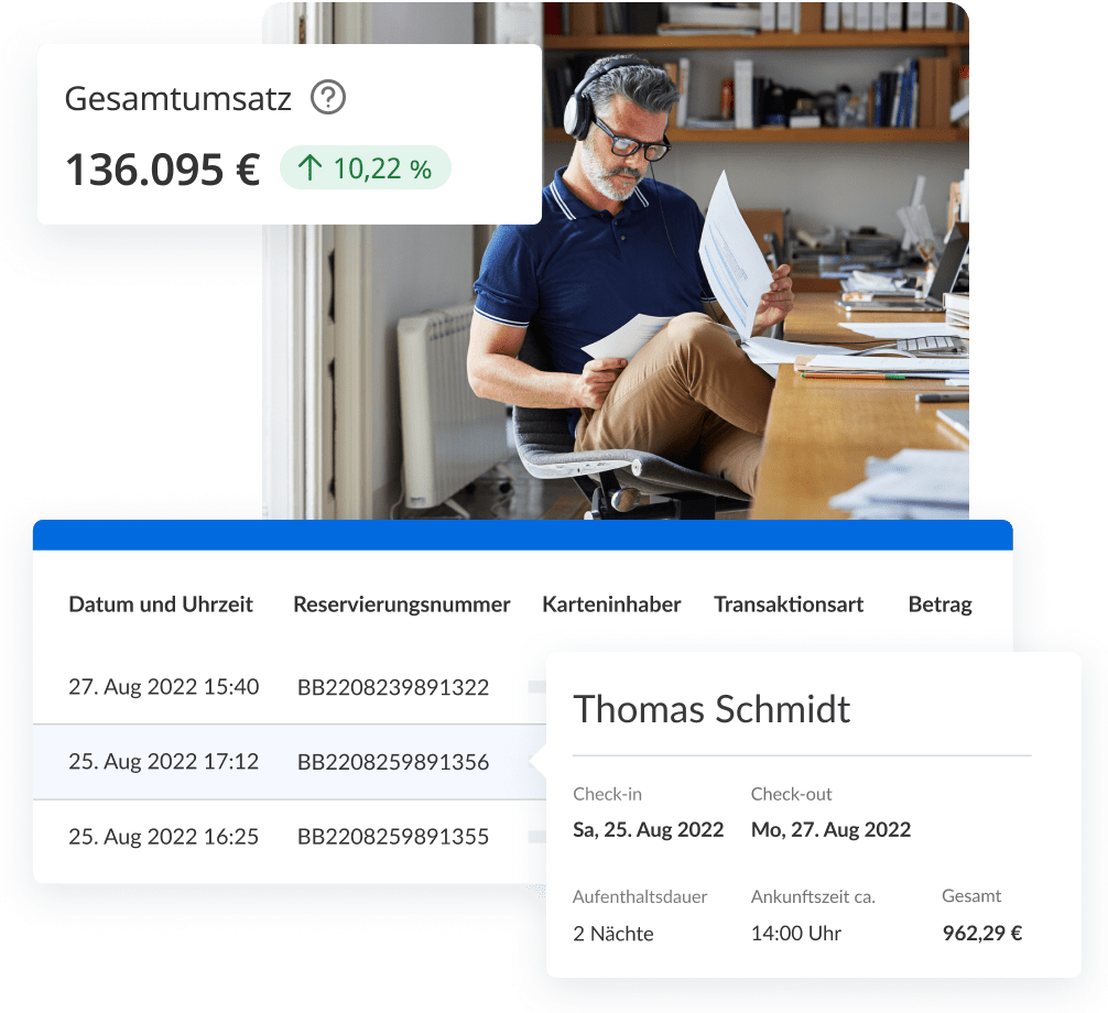 Mit unserem Transaktions-Dashboard in Echtzeit können Sie Ihre Buchungen und Online-Zahlungen ganz einfach abstimmen.