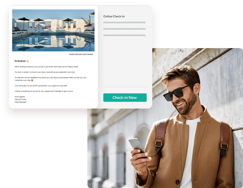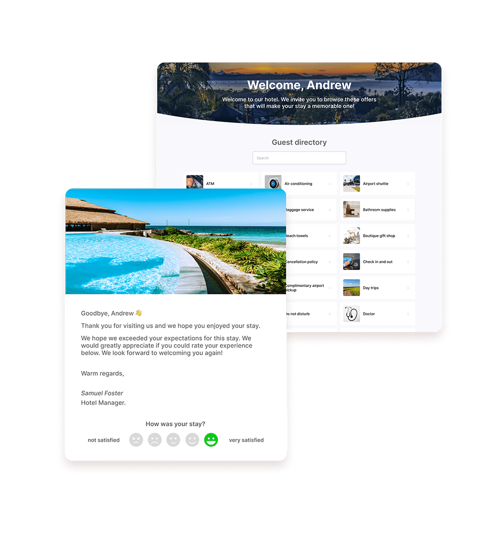 Enhance your guests experience and drive revenue beyond the room with Guest Engagement. Provide a digital check-in experience, send personalised upsell offers, request feedback from guests and more.