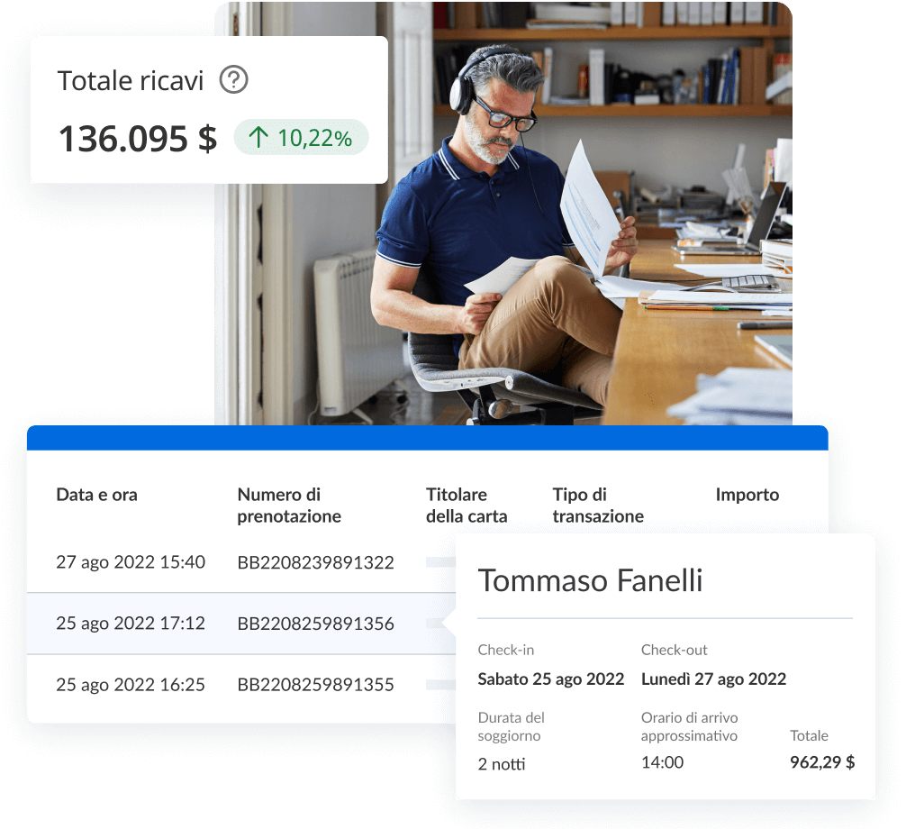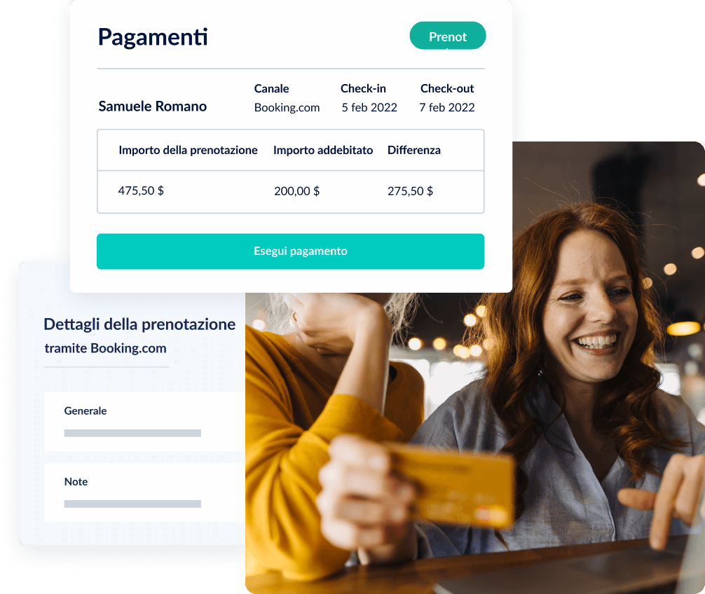 Grazie alla tecnologia integrata potrai elaborare i pagamenti direttamente dal booking engine, accettare le prenotazioni con un solo clic e avere tutti i dati a disposizione in un unico posto. I pagamenti possono essere automatizzati, così non avrai bisogno di inserire dati manualmente.