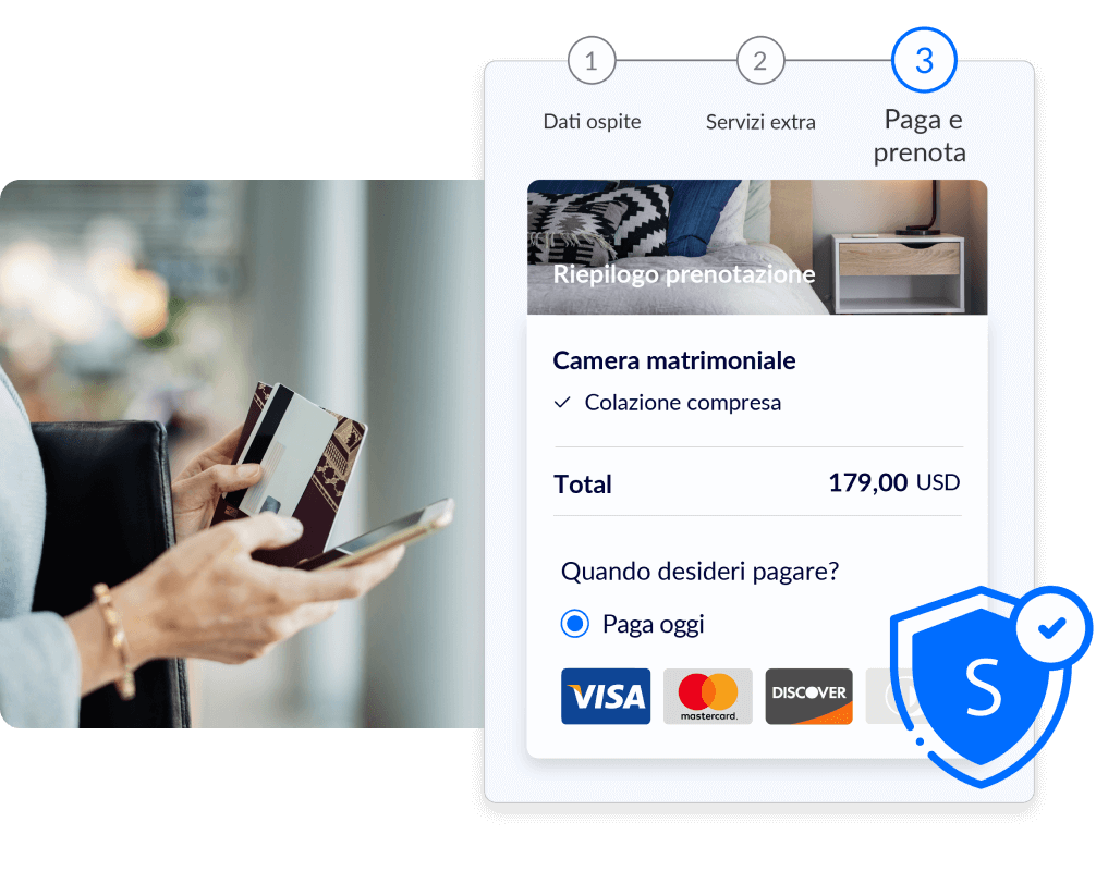 Rassicurate gli ospiti con la possibilità di effettuare pagamenti online sicuri e conformi agli standard PCI-DSS.