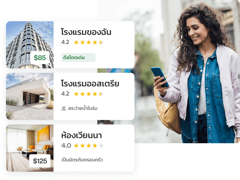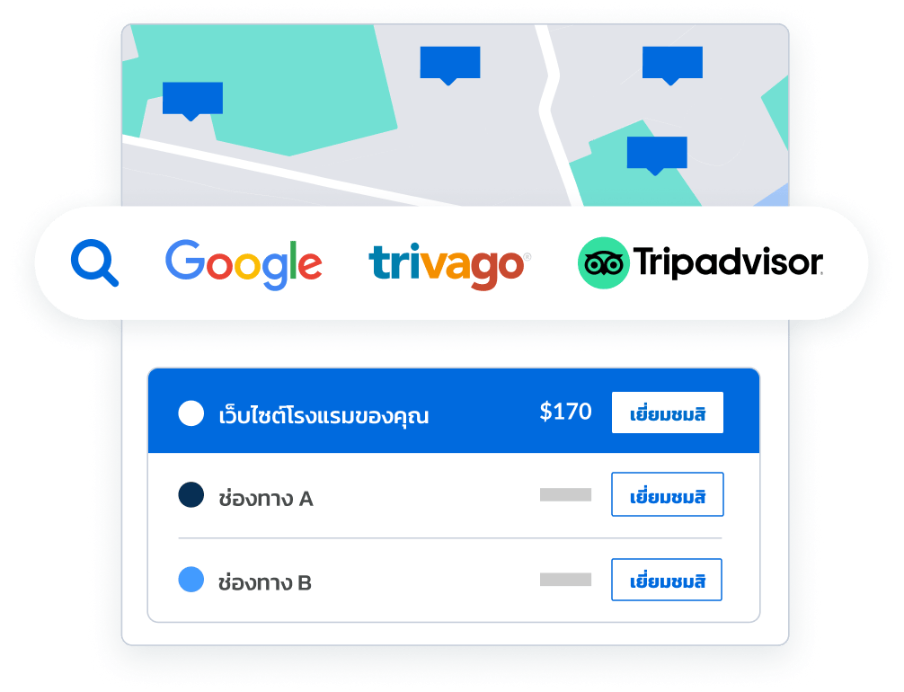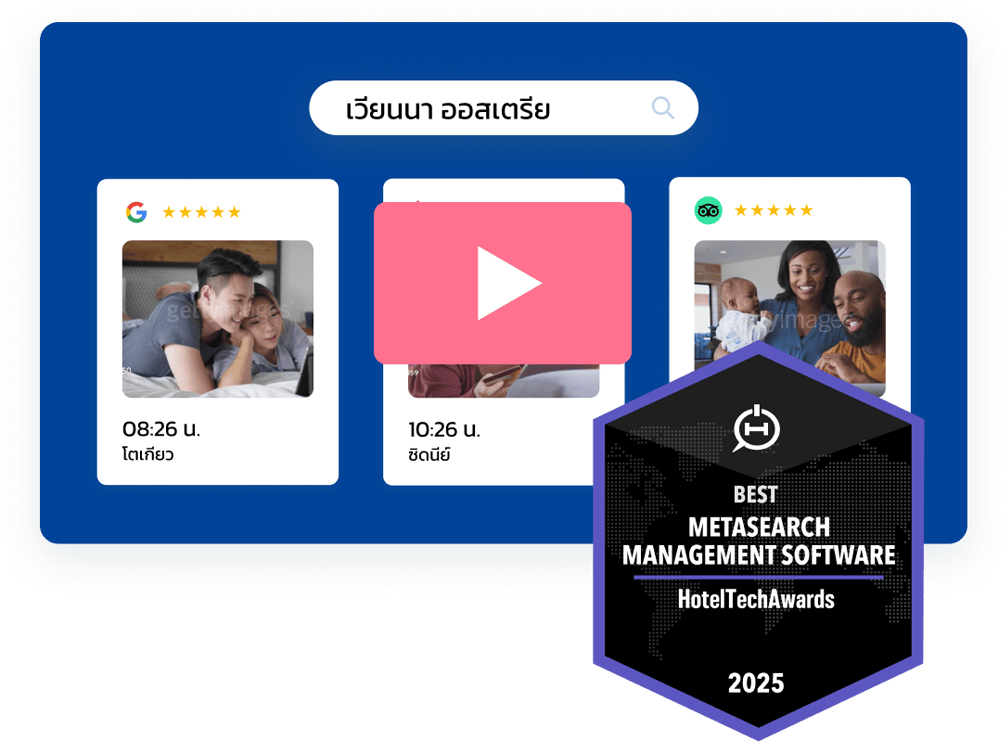 ดูให้แน่ใจว่าธุรกิจที่พักของคุณจะปรากฏเด่นชัด ในที่ที่นักท่องเที่ยวทำการจอง เลือกวิธีที่คุณต้องการคว้าการจองในเมตาเสิร์ช ไม่ว่าจะผ่านบริการที่เราจัดการ หรือจะควบคุมด้วยตนเองก็ตาม
