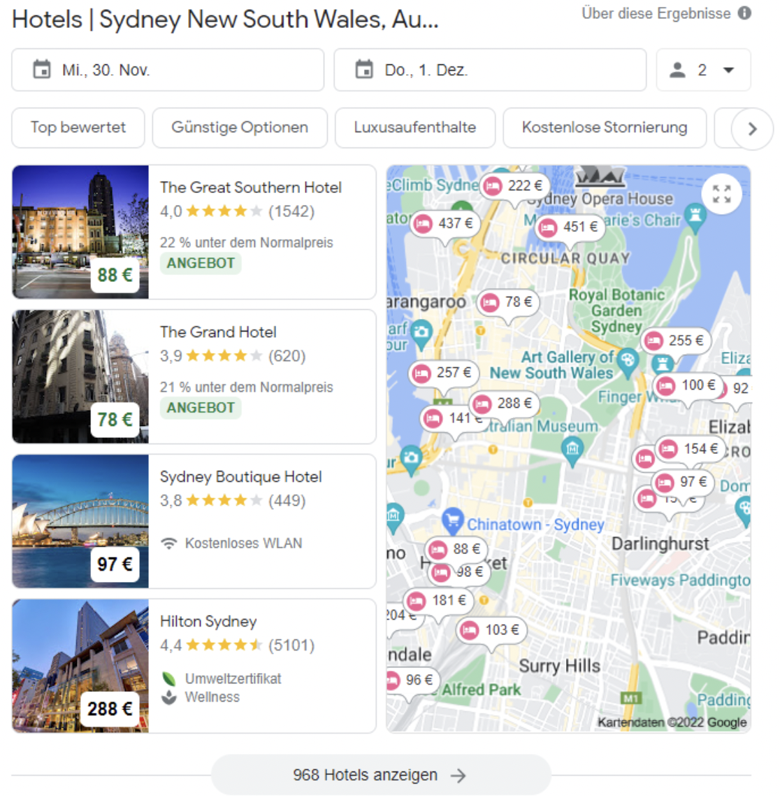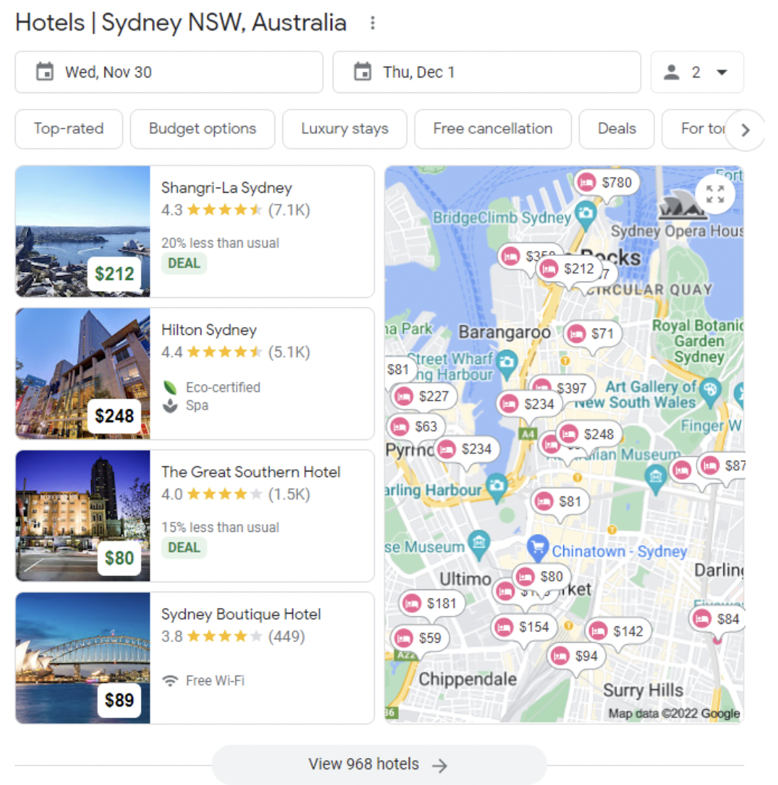 Using geo-targeted strategies, your hotel is also competing differently with other hotels, based on the origin of the search. For example, a search for “hotels in Sydney” originating in Germany returns the following results: