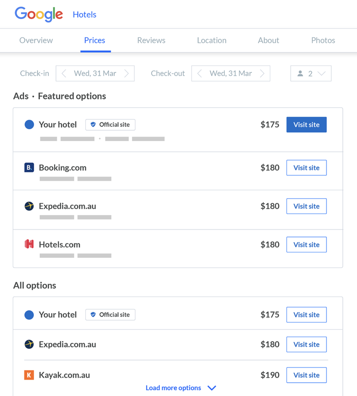 Hotels can choose to use ads to build their strategy beyond the free option, whereby hotels are listed below the Top 4 paid results in ‘All Options’. Using Google Hotel Ads, a hotel should expect to increase its traffic and, in turn, total revenue.