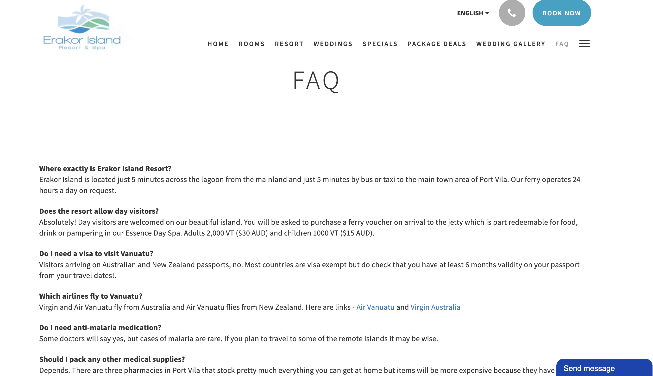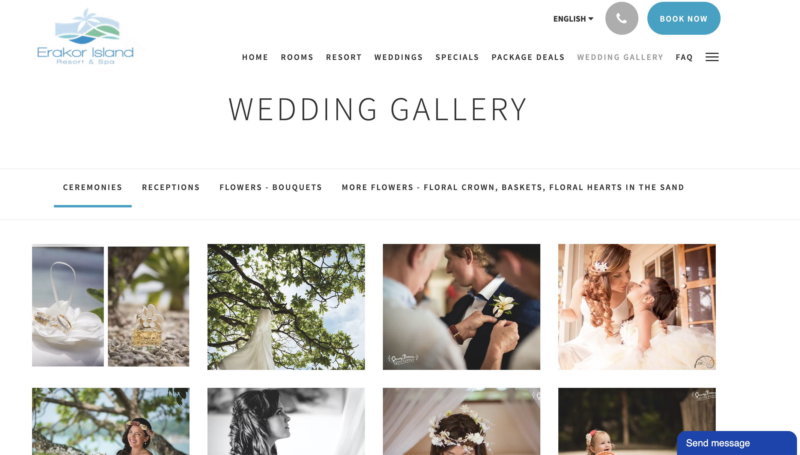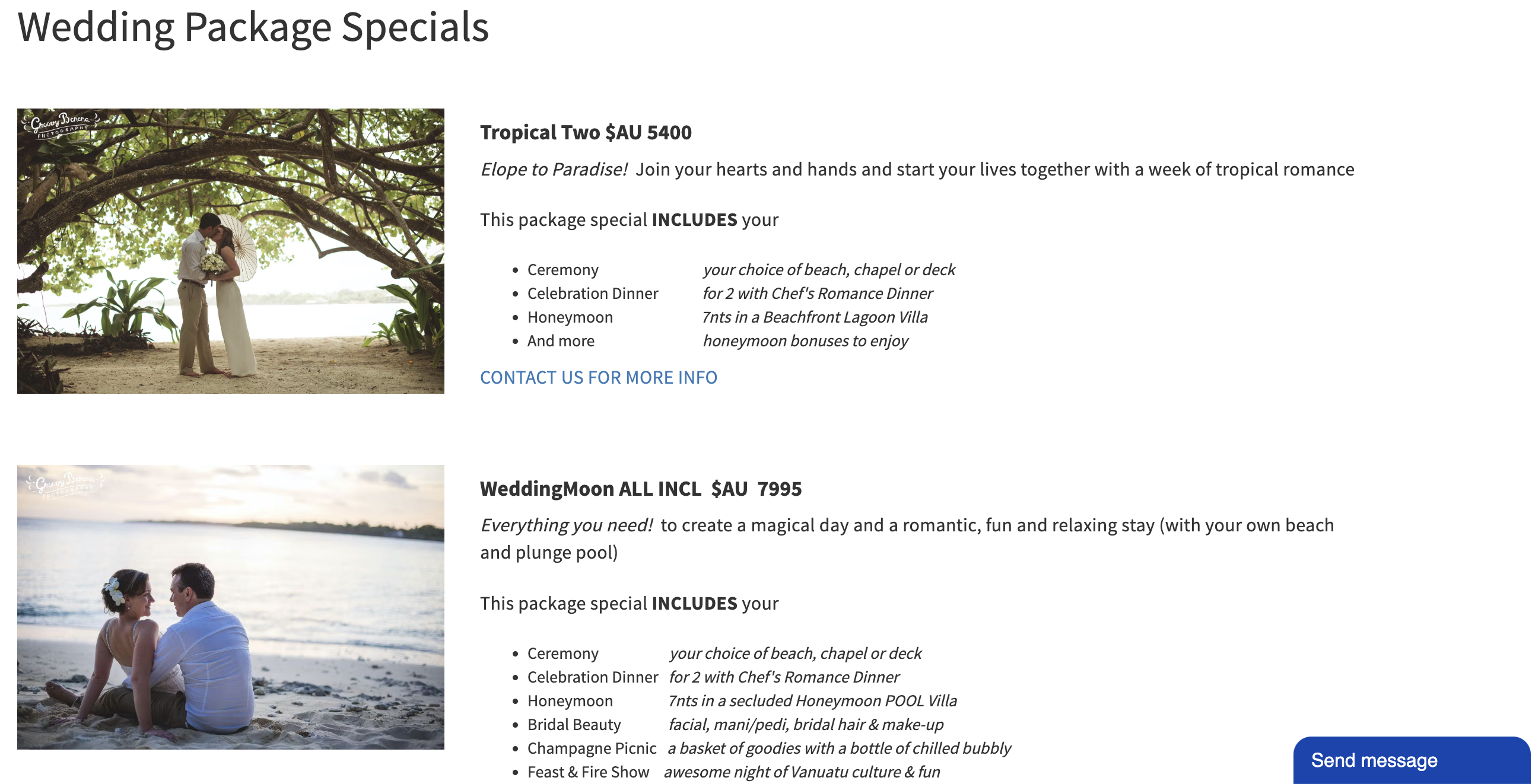 Erakor Island Resort & Spa has used custom pages to create content for the specific services its brand can offer. This includes a page for weddings and wedding packages.