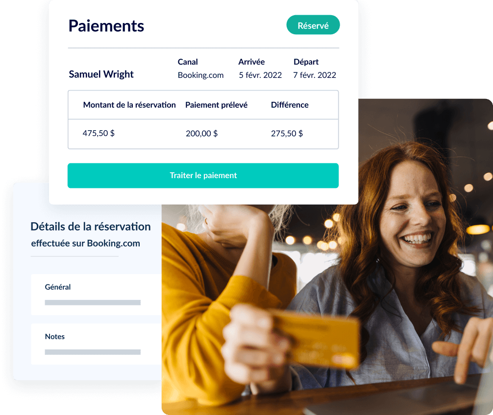 Traitez les paiements des clients rapidement et quand vous le souhaitez. Plus besoin de saisir leurs numéros de cartes de crédit manuellement au moment de leur départ.